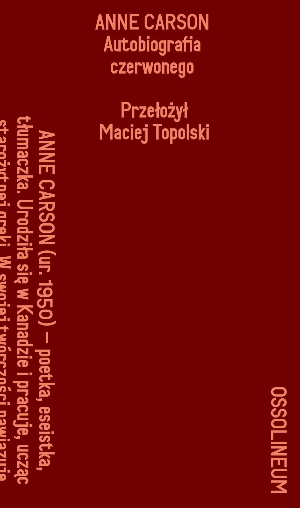 Gerion, wrażliwy skrzydlaty chłopiec o czerwonej skórze, zaczyna tworzyć swoją autobiografię, gdy ma pięć lat. Pewnego dnia, już jako zagubiony młodzieniec, natrafia na butnego włóczęgę Heraklesa. Ich spotkanie jest jak wybuch wulkanu. Istnieje wiele sposobów na opowiedzenie takiej historii – notuje Anne Carson. Jednym z nich jest grecki mit o nieustraszonym herosie oraz jego dwunastu pracach. Innym – stworzony przez poetę Stezychora poemat Gerioneida, opisujący życie skrzydlatego odmieńca, w spokoju doglądającego swej czerwonej trzody i zabitego przez gwałtownego grabieżcę, wysłannika cywilizacji. Carson sięga do antycznych historii, by opowiedzieć je na nowo: to zdumiewająco obrazowa i zarazem erudycyjna książka o zwyczajnej, po ludzku zwyczajnej,źle wybranej miłości, ale też refleksja o byciu innym. Autobiografia czerwonego jest powieścią-poematem, rozszczelniającą ramy gatunkowe i wyrastającą z praktyki przekładu literackiego, napisaną po Homerze i Stezychorze, po Emily Dickinson i Gertrude Stein – dowcipną, inteligentną, niepowtarzalną.,